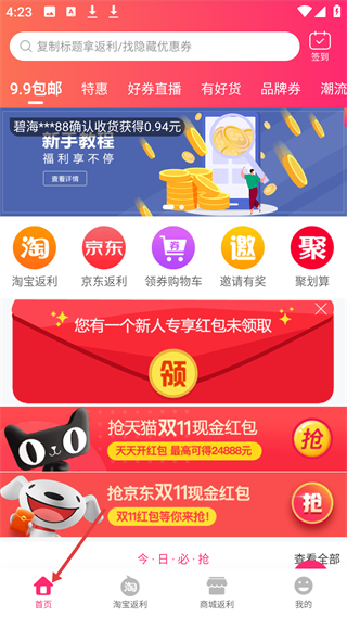 1、首頁有9.9包郵、特惠等板塊,淘寶、京東返利入口清晰,可搶雙11現(xiàn)金紅包,新人有專享紅包,還推今日必?fù)屔唐?,助力省錢購物。
