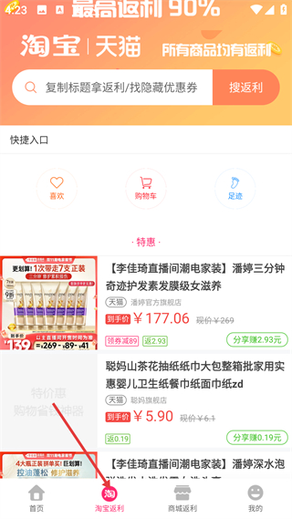 2、淘寶返利界面,最高返利百分之九十刺激消費,搜索欄支持找返利,快捷入口喜歡、購物車便捷操作,特惠商品帶返利、分享賺。