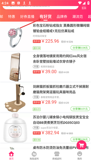 3、有好貨板塊展示彩鉆戒指、全身鏡等商品,到手價實惠,返利與分享賺金額標(biāo)注清晰,涵蓋珠寶、家居、寵物用品等品類。