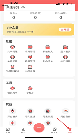 3、我的板塊有共享記賬、禮簿管理等功能,還有VIP會(huì)員特權(quán)和多種工具,滿足用戶多樣記賬需求功能豐富全面。