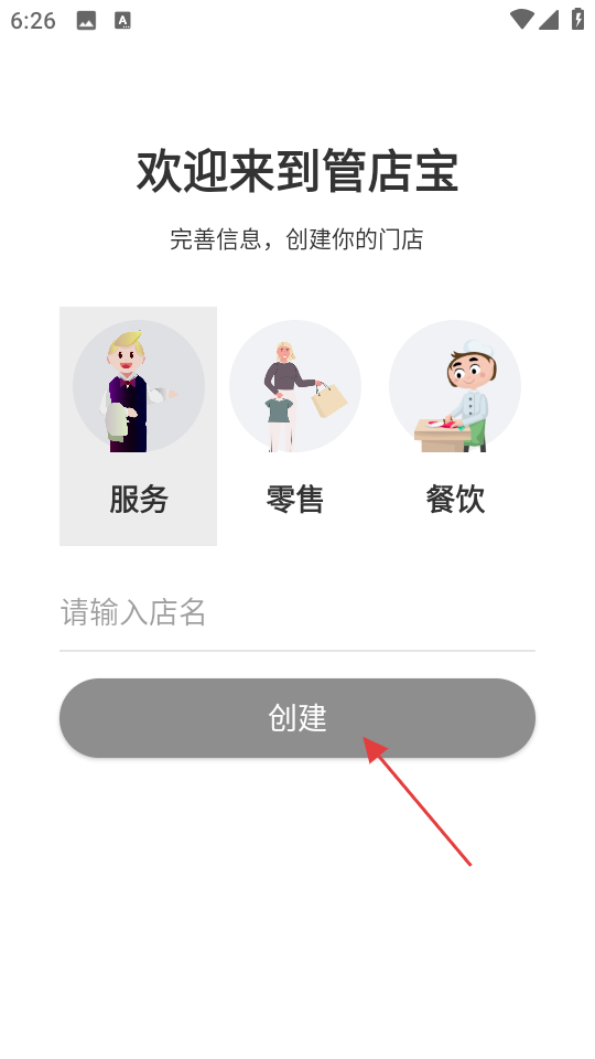1、打開APP進入歡迎頁面,在這里你可以選擇門店類型,有服務(wù)、零售、餐飲三種選項,選擇好門店類型后,在下方輸入框中輸入店名,點擊創(chuàng)建按鈕即可完成門店創(chuàng)建。