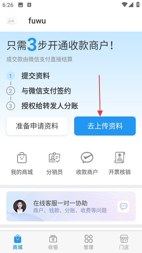 2、門店創(chuàng)建完成后進入相關(guān)頁面,點擊去上傳資料按鈕,開始準備和上傳開通收款商戶所需的資料,同時頁面還有我的商城、分銷員等功能入口,可根據(jù)需求進行操作。