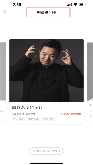 1、明星設(shè)計(jì)師頁展示謝芳勇等設(shè)計(jì)師,設(shè)計(jì)費(fèi)200、800元,強(qiáng)調(diào)做有溫度的設(shè)計(jì),可查看全部設(shè)計(jì)師。