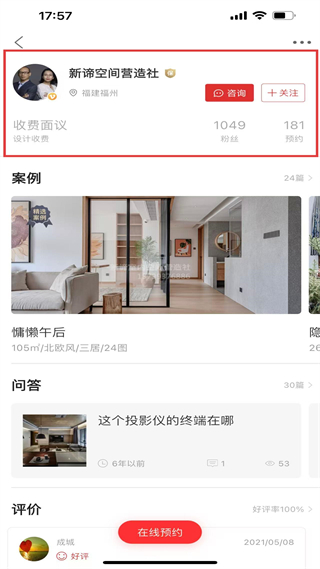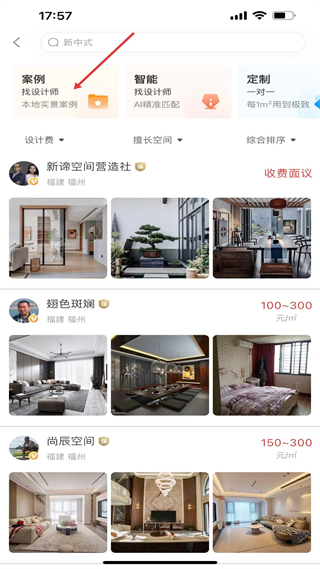 3、找設(shè)計(jì)師頁有案例、智能找設(shè)計(jì)師功能,展示新諦空間營(yíng)造社等本地設(shè)計(jì)師,可按設(shè)計(jì)費(fèi)等篩選。