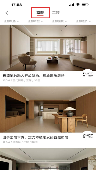 4、家裝頁展示現(xiàn)代簡(jiǎn)約、原木風(fēng)案例,如150極簡(jiǎn)居所、120自然極簡(jiǎn)居所,呈現(xiàn)多樣家裝風(fēng)格。