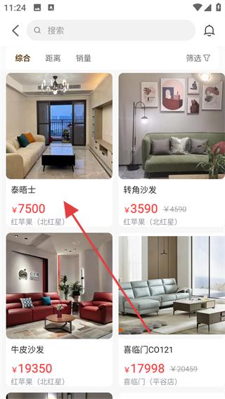 3、在商品展示頁面,看到各類家居商品,如沙發(fā)、床等,還有綜合、距離、銷量等排序方式,挑選感興趣的商品,比如泰晤士相關(guān)商品。