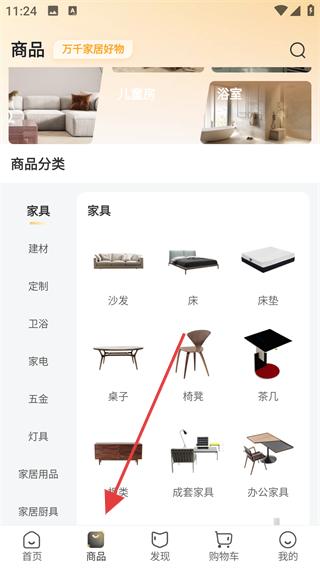 2、登錄后進(jìn)入商品頁面,看到商品分類板塊,有家具、建材等各類分類,可根據(jù)需求選擇不同分類,瀏覽相關(guān)家居商品。