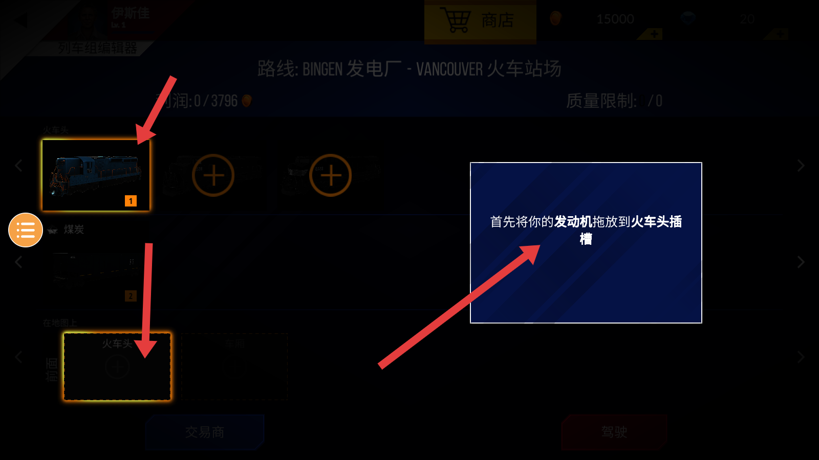 1、進(jìn)入游戲,先將發(fā)動機(jī)拖放到火車頭插槽,完成火車頭的發(fā)動機(jī)裝配,為后續(xù)駕駛做準(zhǔn)備。