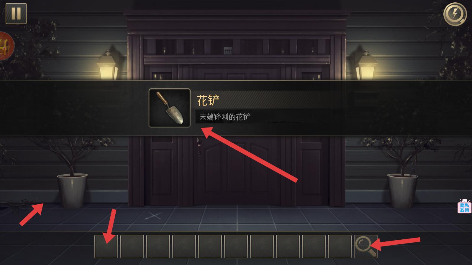 1、在大門口,尋找并獲取花鏟,將其放入下方道具欄,為后續(xù)探索收集關鍵工具。