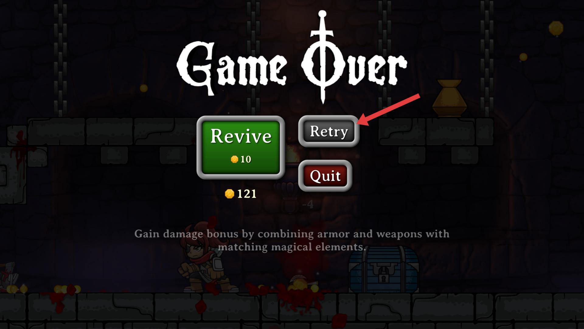 4、若游戲失敗,界面會(huì)顯示Game Over,此時(shí)可點(diǎn)擊Retry按鈕,重新挑戰(zhàn)該關(guān)卡,繼續(xù)地牢冒險(xiǎn),爭(zhēng)取更好的游戲結(jié)果。