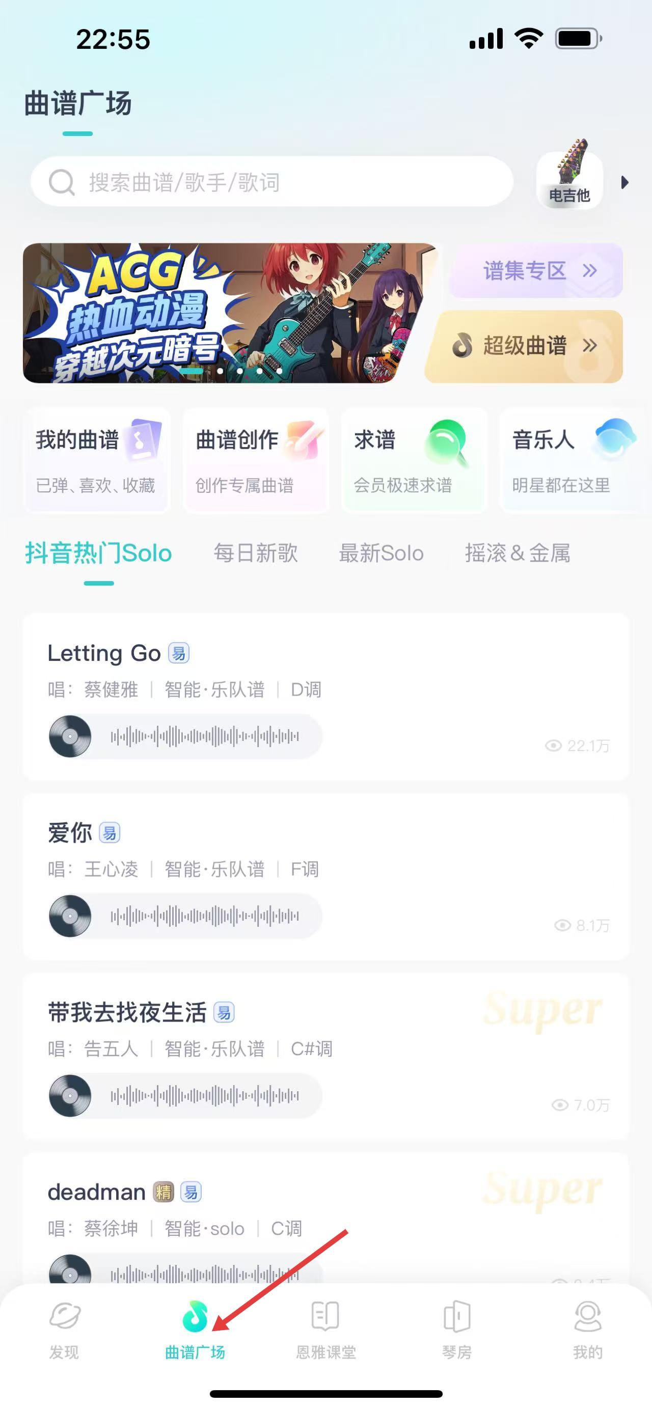 2、曲譜廣場有抖音熱門Solo、每日新歌分類,含蔡健雅、王心凌等歌手曲譜,支持創(chuàng)作、求譜,資源多樣互動(dòng)性強(qiáng)。