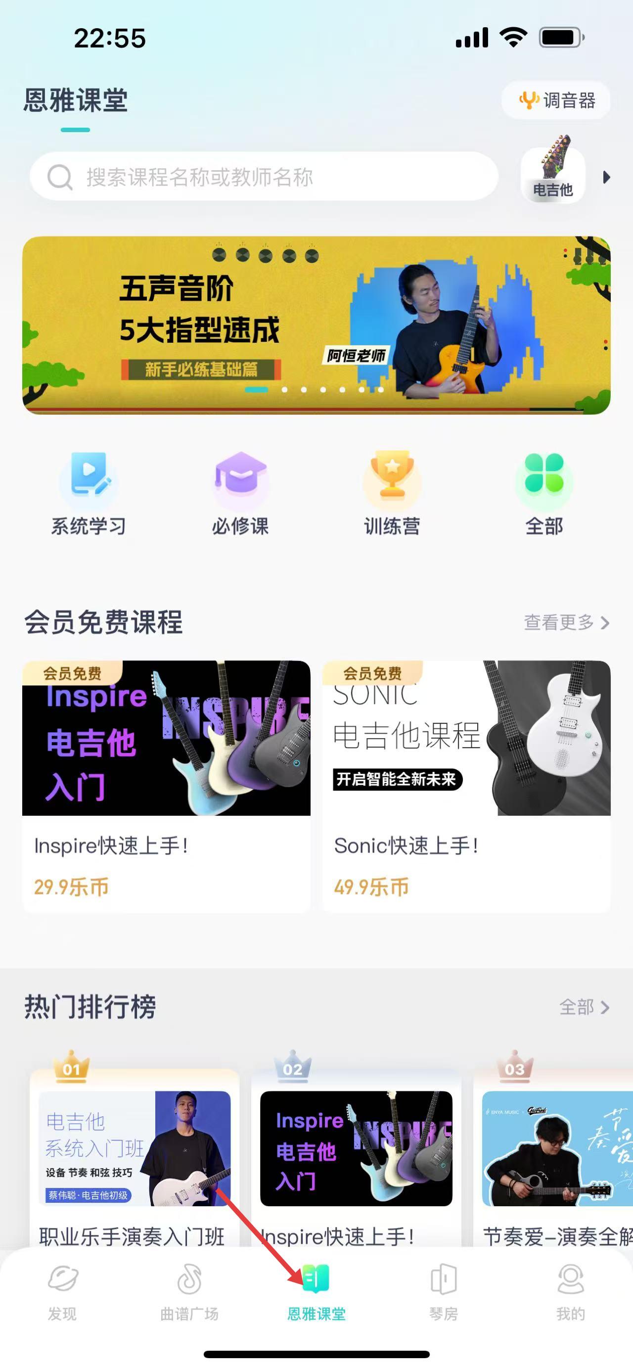 3、恩雅課堂有系統(tǒng)學(xué)習(xí)、必修課板塊,會(huì)員免費(fèi)電吉他入門課,熱門排行榜有職業(yè)樂手入門班助力吉他學(xué)習(xí)。