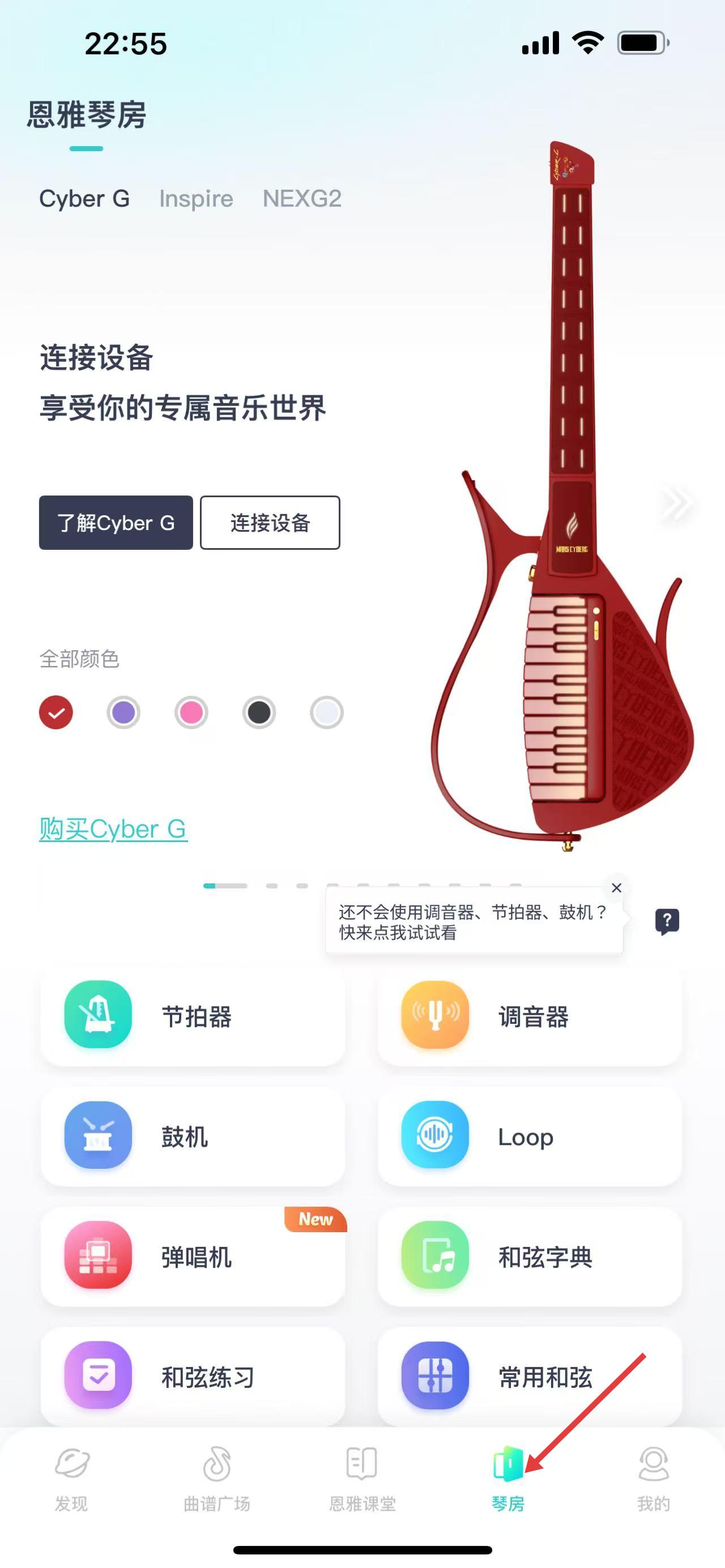 4、琴房可連接Cyber G設(shè)備,有節(jié)拍器、調(diào)音器等工具,還有彈唱機(jī)、和弦字典,為吉他演奏提供專業(yè)輔助。
