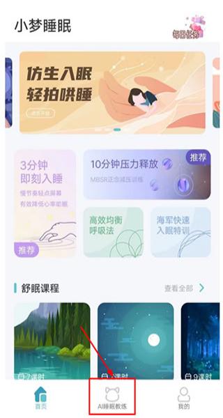 1、打開小夢睡眠應用程序,于首頁定位AI睡眠教練按鈕,輕點該按鈕,進入專屬睡眠訓練指導空間。