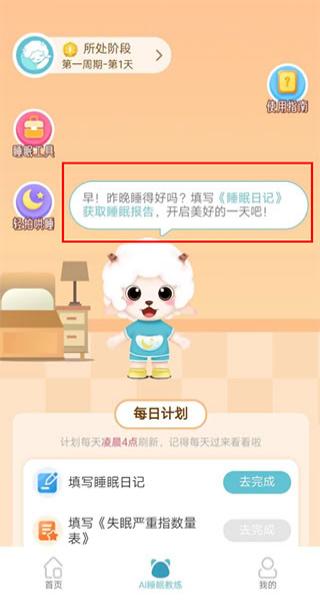 2、進入AI睡眠教練頁面,留意提示信息,找到填寫睡眠日記任務項,點擊后按頁面引導輸入睡眠相關信息。