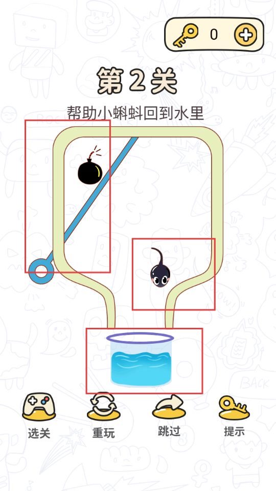 2、在關(guān)卡中根據(jù)任務(wù)要求,如幫助小蝌蚪回到水里,觀察場(chǎng)景中的元素,規(guī)劃操作,避開(kāi)炸彈等障礙。