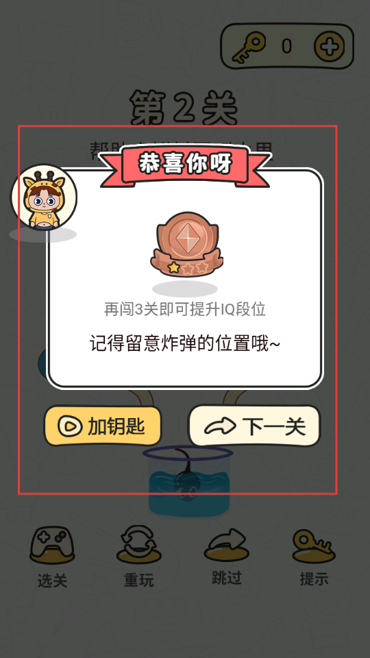 3、成功完成關(guān)卡任務(wù)后,會(huì)獲得恭喜提示,可選擇加鑰匙或進(jìn)入下一關(guān),繼續(xù)挑戰(zhàn),積累闖關(guān)次數(shù)提升IQ段位。