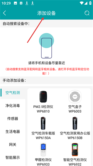 3、添加設(shè)備板塊支持自動搜索和手動添加,涵蓋空氣檢測、凈化消毒等多類設(shè)備,還支持藍牙配網(wǎng),方便用戶添加各類智能設(shè)備。