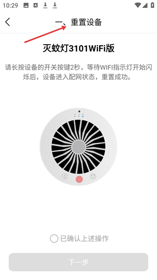 4、重置設(shè)備板塊詳細講解滅蚊燈3101WiFi版重置操作,長按開關(guān)按鍵2秒,待WiFi指示燈閃爍即進入配網(wǎng)狀態(tài),完成設(shè)備重置,為后續(xù)配網(wǎng)做好準備。