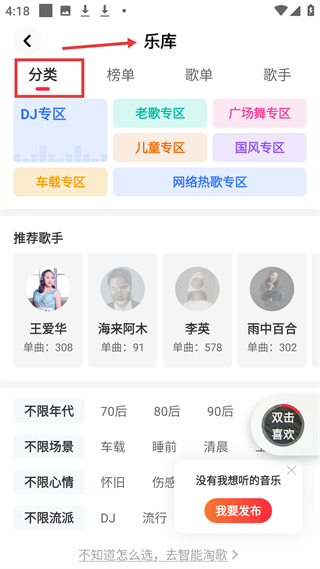 3、樂庫(kù)板塊分DJ、老歌等專區(qū),還有推薦歌手和多維度篩選,方便用戶精準(zhǔn)查找音樂,讓音樂選擇更具針對(duì)性。