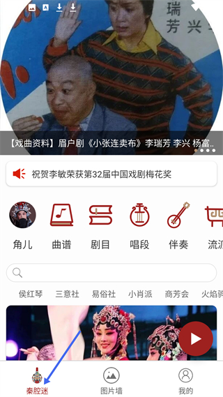 1、秦腔迷頁(yè)面有戲曲資料展示,如眉戶劇小張連賣布,還有角兒、曲譜等功能入口,可搜索侯紅琴、三意社等戲曲相關(guān)內(nèi)容。
