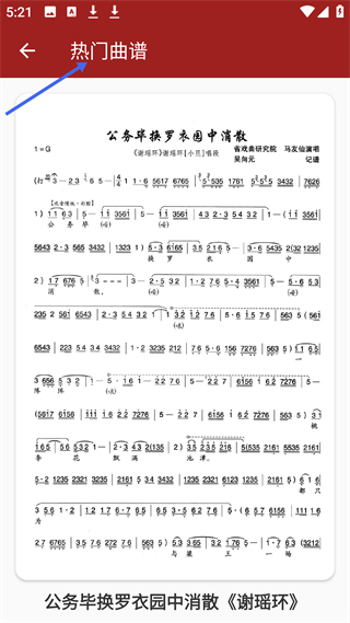 2、熱門(mén)曲譜頁(yè)面展示謝瑤環(huán)中公務(wù)畢換羅衣園中消散唱段的曲譜,包含樂(lè)譜、唱詞等,方便戲曲愛(ài)好者學(xué)習(xí)演唱。
