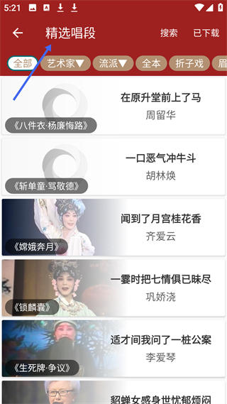 3、精選唱段頁(yè)面,有八件衣楊廉悔路、斬單童罵敬德等唱段,可按藝術(shù)家、流派等分類查找,還有全本、折子戲等選項(xiàng)。