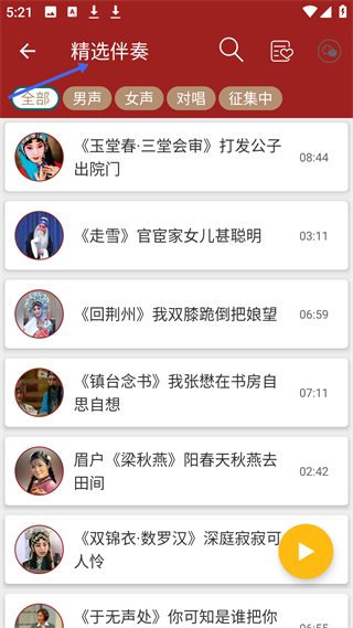 4、精選伴奏頁(yè)面有玉堂春三堂會(huì)審走雪等戲曲伴奏,可按男聲、女聲、對(duì)唱等分類,方便用戶根據(jù)需求選擇使用。