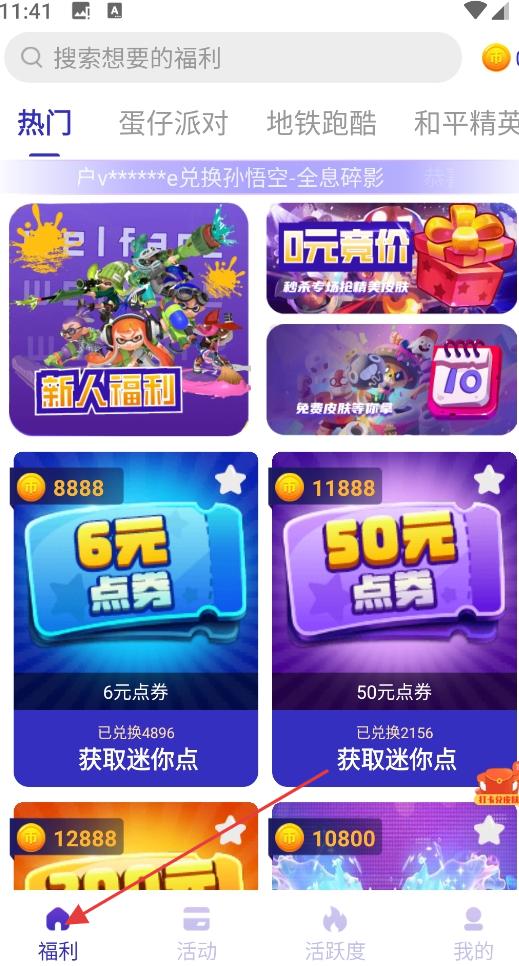 3、示了新人福利、免費皮膚等多種福利內(nèi)容,用戶可通過獲取迷你點兌換點券等福利,還可在福利、活動、活躍度和我的之間切換。