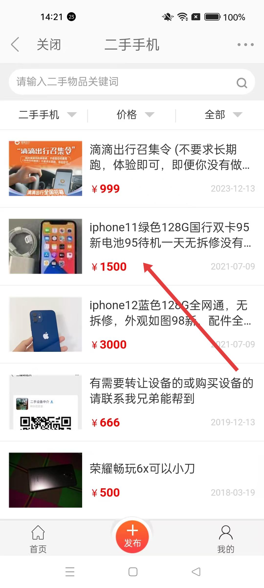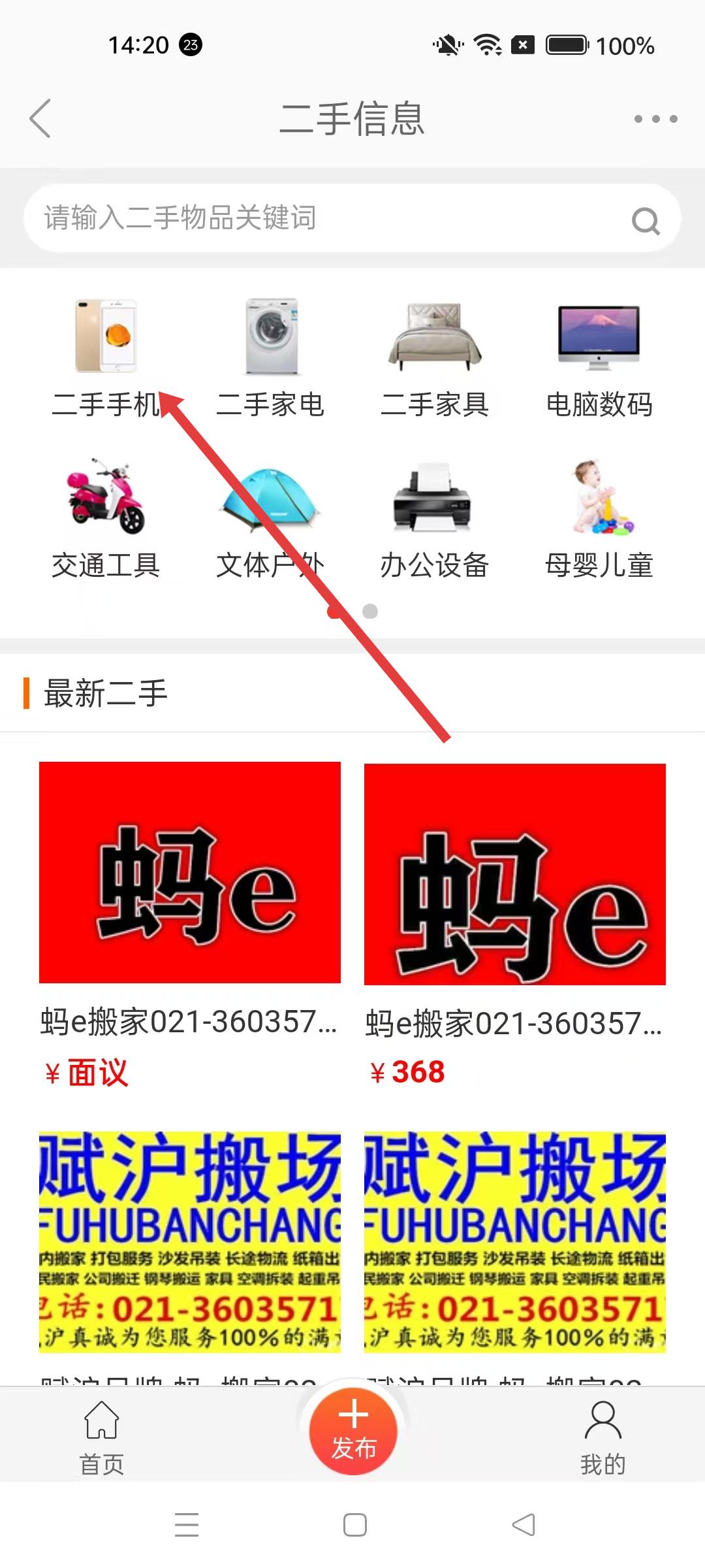 2、就會(huì)來到二手信息界面,選擇二手手機(jī)分類,進(jìn)入二手手機(jī)列表頁面。