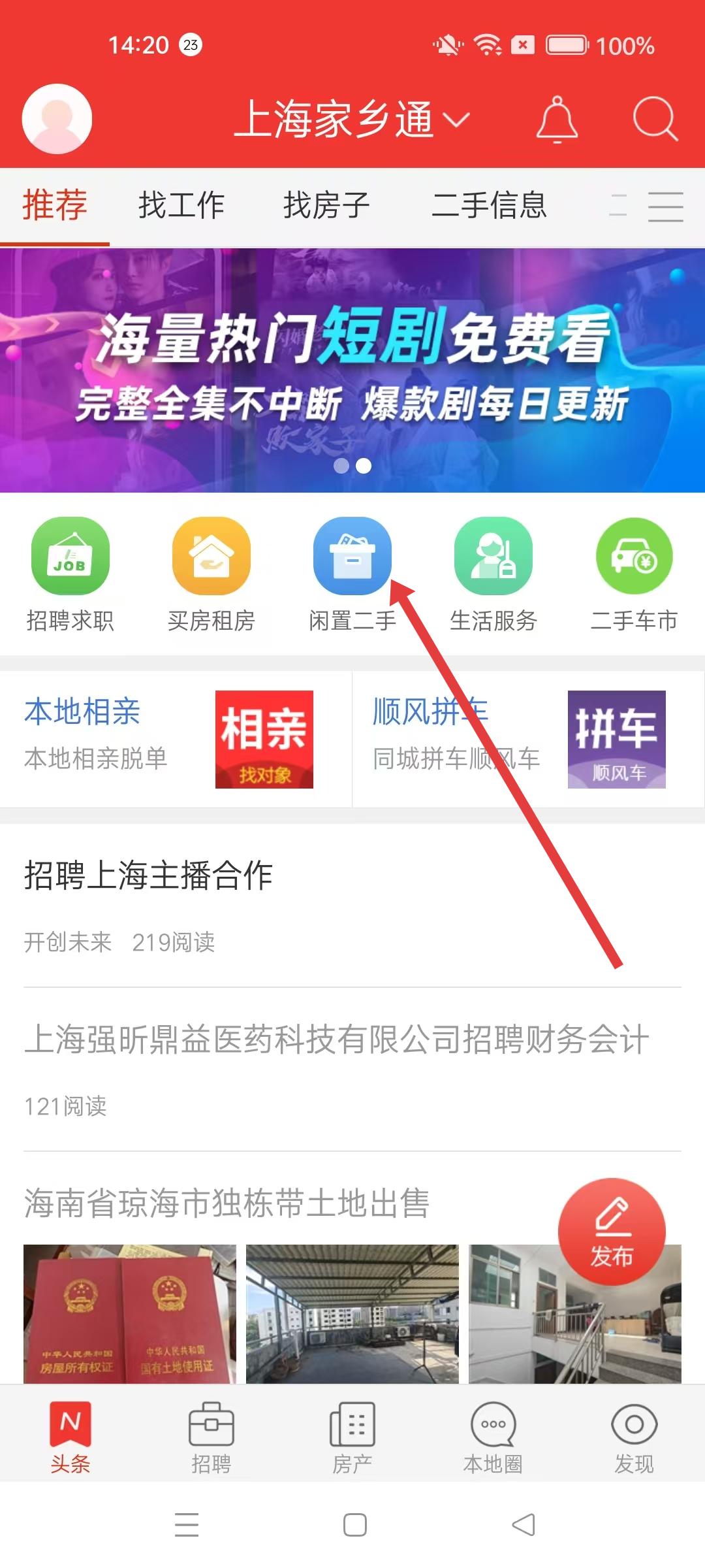 1、進(jìn)入首頁上海家鄉(xiāng)通APP首頁,點(diǎn)擊閑置二手選項(xiàng),進(jìn)入二手信息界面。