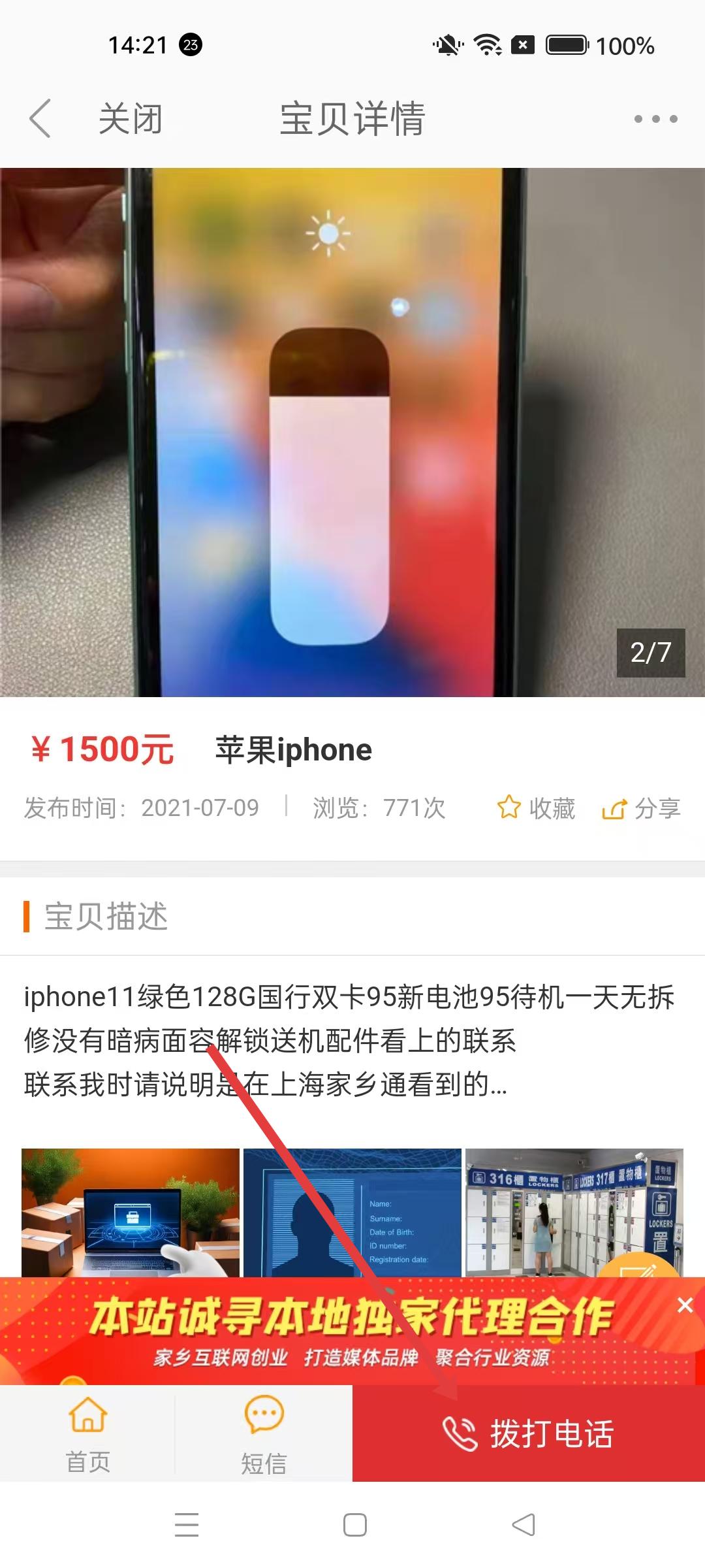 4、寶貝詳情頁面,可查看手機(jī)的價(jià)格、發(fā)布時(shí)間、瀏覽次數(shù)以及詳細(xì)描述等信息,還可進(jìn)行收藏、分享或撥打電話聯(lián)系賣家等操作。
