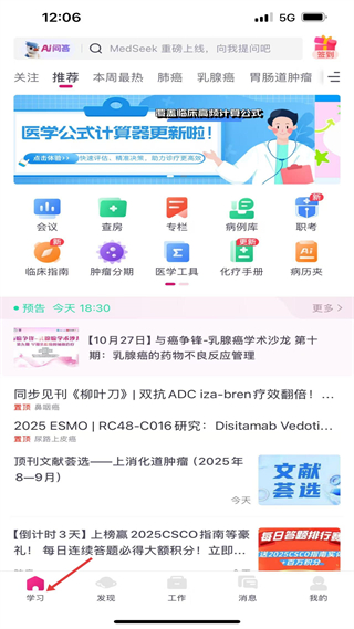 1、學(xué)習(xí)頁(yè)有醫(yī)學(xué)公式計(jì)算器推薦,功能入口含會(huì)議、查房等,還有乳腺癌學(xué)術(shù)沙龍預(yù)告、頂刊文獻(xiàn),助力醫(yī)學(xué)學(xué)習(xí)決策。
