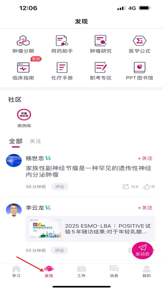 2、發(fā)現(xiàn)頁(yè)有腫瘤分期、用藥助手等功能,社區(qū)展示楊世忠、李云龍等醫(yī)學(xué)內(nèi)容,可發(fā)動(dòng)態(tài)交流。
