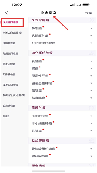 3、臨床指南頁(yè)分類涵蓋頭頸部、消化系統(tǒng)等腫瘤,細(xì)分鼻咽癌、食管癌等類型,方便查找對(duì)應(yīng)臨床指南。