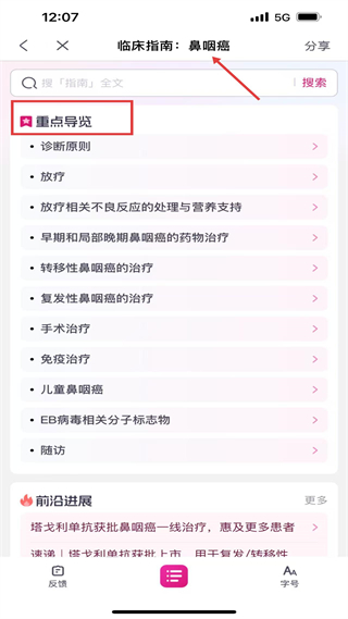 4、鼻咽癌臨床指南頁(yè),重點(diǎn)導(dǎo)覽含診斷、放療等板塊,還有塔戈利單抗獲批進(jìn)展,助力診療學(xué)習(xí)。