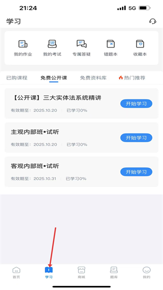 2、學習板塊有我的作業(yè)、專屬答疑等功能,免費公開課如三大實體法系統(tǒng)精講可學習,滿足法考課程學習與互動需求。