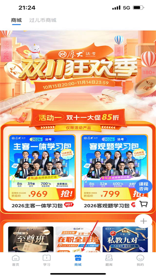 3、商城板塊有雙11狂歡季活動,2026法考學習包85折優(yōu)惠,提供法考學習資料選購,助力備考資源獲取。
