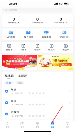 4、題庫板塊有VIP刷題、年編真題等功能,刑法、民法等學科真題可練習,輔助法考刷題鞏固知識點。
