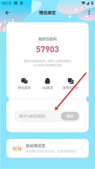 3、進(jìn)入情侶綁定頁面看到自己的匹配碼,可通過微信邀請、QQ邀請或復(fù)制匹配碼的方式,讓對方注冊情侶簽并填寫匹配碼,也可填寫對方的匹配碼后點(diǎn)擊綁定。