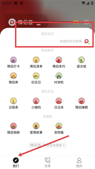 1、打開情侶簽APP,進(jìn)入我們頁面看到情侶定位等功能區(qū)域,以及情侶打卡、情侶清單等功能入口,準(zhǔn)備進(jìn)行情侶相關(guān)操作。