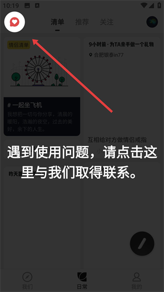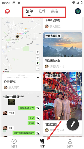 4、完成情侶綁定后進(jìn)入日常頁面,看到清單、推薦、關(guān)注等分類,可在這些分類下瀏覽相關(guān)內(nèi)容,記錄和分享情侶日常。