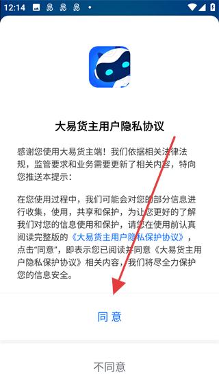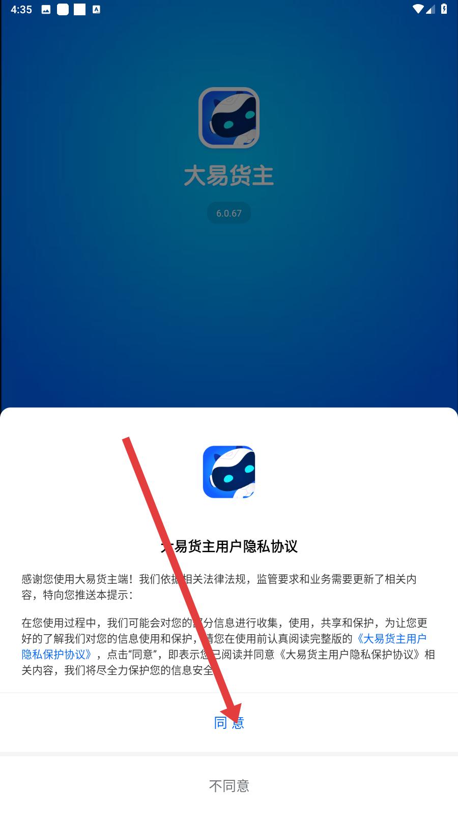 1、進入軟件隱私協(xié)議頁面,閱讀大易貨主用戶隱私協(xié)議,了解信息收集與保護內(nèi)容,點擊同意,完成協(xié)議確認(rèn),開啟軟件使用流程。