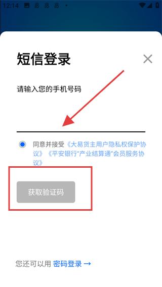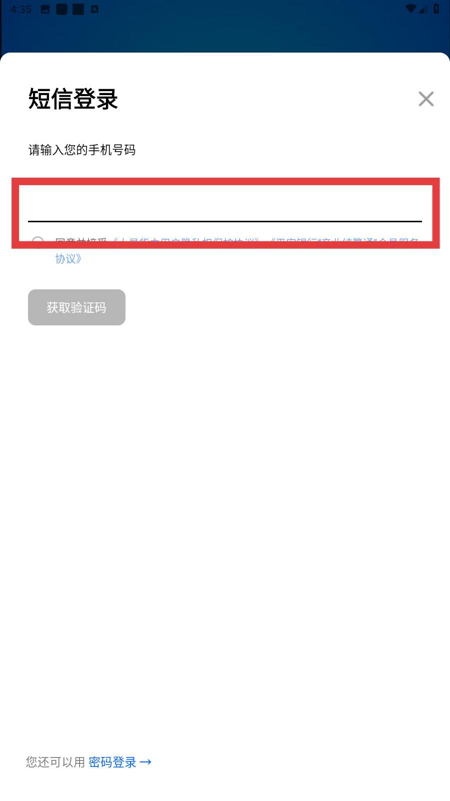 3、選擇短信登錄輸入手機號碼,同意并接受相關(guān)協(xié)議,點擊獲取驗證碼,輸入驗證碼完成登錄,獲取軟件使用權(quán)限,開啟金融服務(wù)體驗。