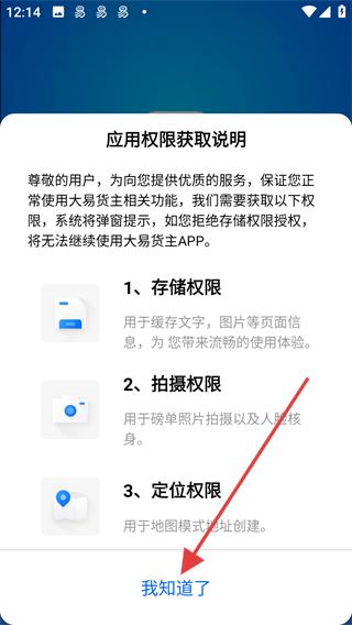 2、在應(yīng)用權(quán)限獲取說明頁面,查看存儲、拍攝、定位等權(quán)限用途,點擊我知道了,確認(rèn)權(quán)限獲取,保障軟件功能正常使用。