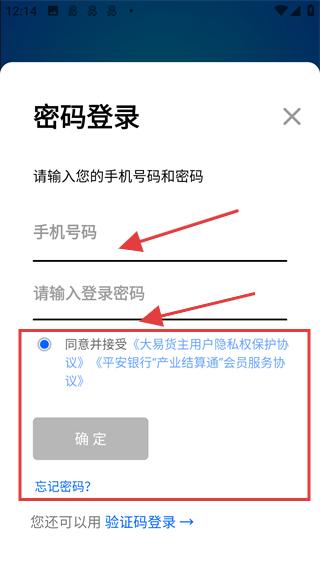 4、選擇密碼登錄輸入手機號碼和登錄密碼,同意并接受相關(guān)協(xié)議,點擊確定完成登錄可使用驗證碼登錄或找回密碼。