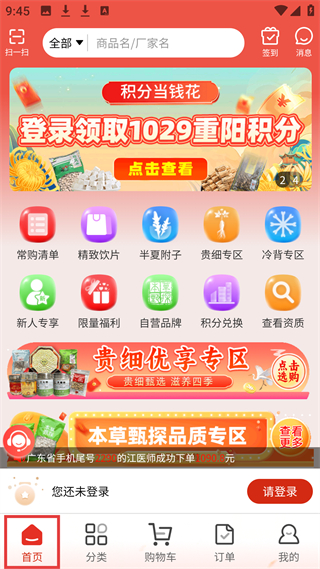 1、首頁有登錄領(lǐng)重陽積分活動(dòng),功能入口含常購清單等,還有貴細(xì)、本草甄探專區(qū),未登錄可看推薦內(nèi)容。