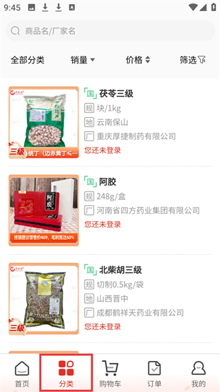 2、分類頁展示茯苓三級(jí)、阿膠、北柴胡三級(jí)等中藥材,標(biāo)注規(guī)格、產(chǎn)地、廠家,未登錄狀態(tài)下可瀏覽商品信息。