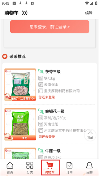 3、購物車頁顯示購物車為空,有采采推薦的茯苓三級(jí)、金銀花一級(jí)等中藥材,未登錄狀態(tài)下可查看推薦商品。