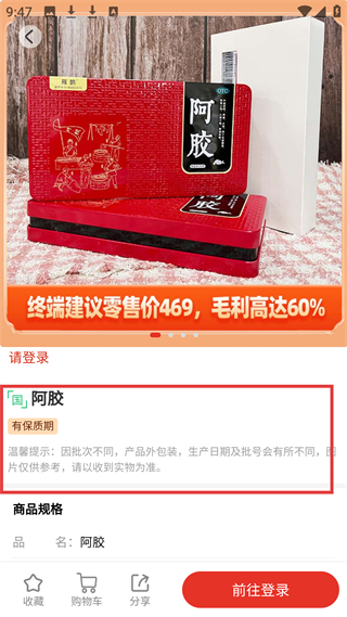 4、阿膠詳情頁展示阿膠鐵盒包裝,終端零售價(jià)469元,毛利60,有保質(zhì)期,未登錄可看商品規(guī)格。
